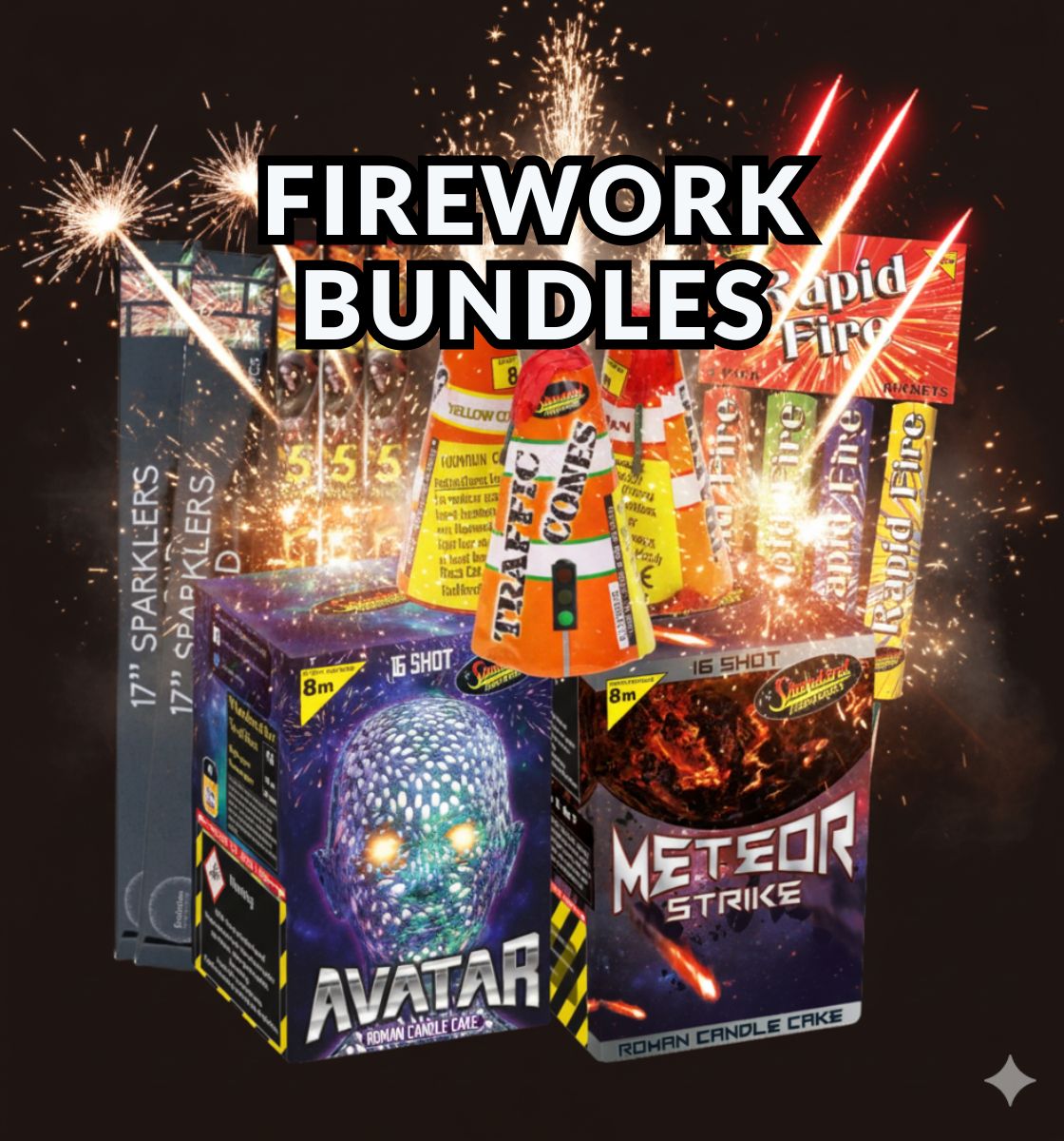 Our extensive selection of fireworks includes Selection Boxes - Perfect for those who want a little bit of everything; Barrages & Cakes - For a grand display that will wow your guests; Rockets - Shoot up into the sky for that breathtaking burst of color; Fountains - Create sparkling effects that light up the night; Fun Snaps & Sparkles - Add some fun and excitement to any gathering; Smoke Grenades - Ideal for dramatic effects in photos and videos; Roman Candles & Catherine Wheels - Classic options that never go out of style; Display Kits - Everything you need for a professional-grade show.