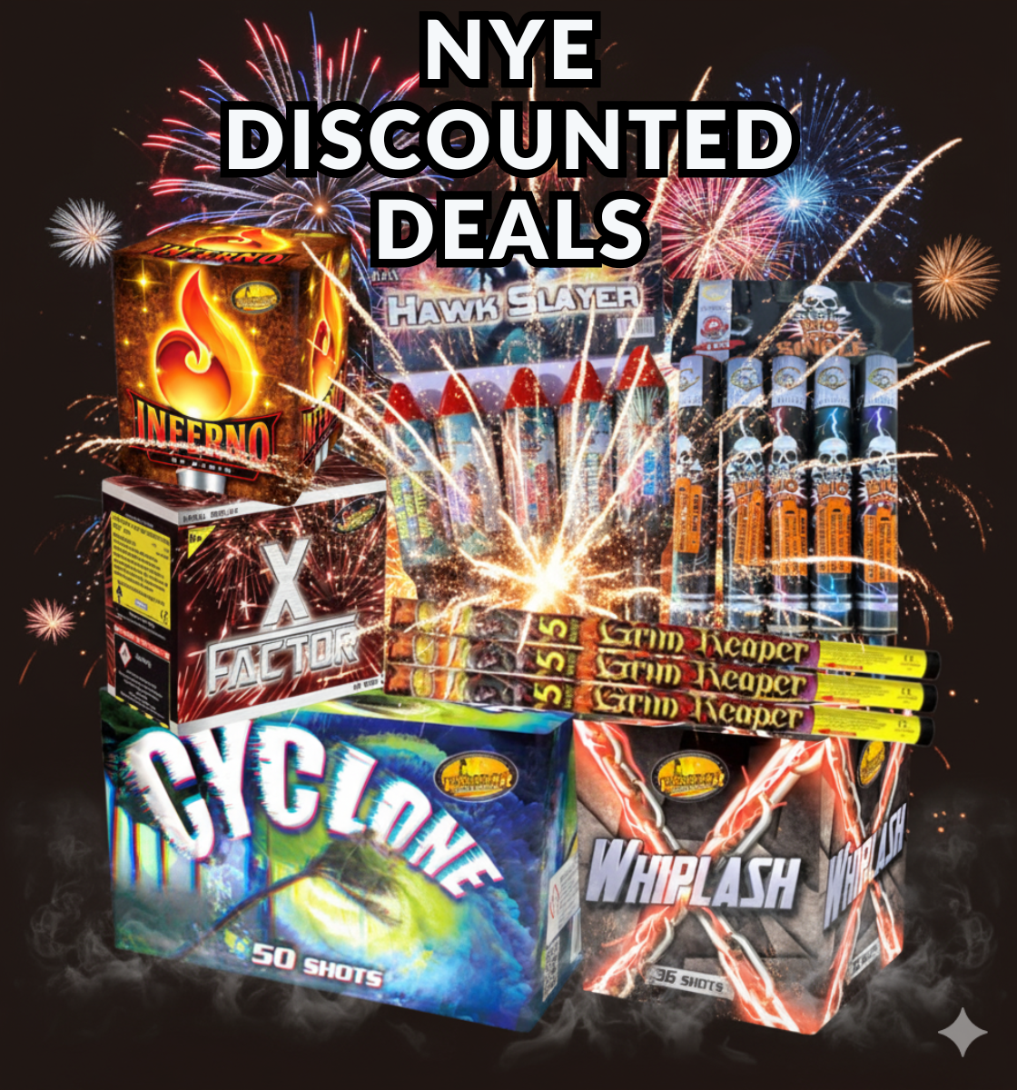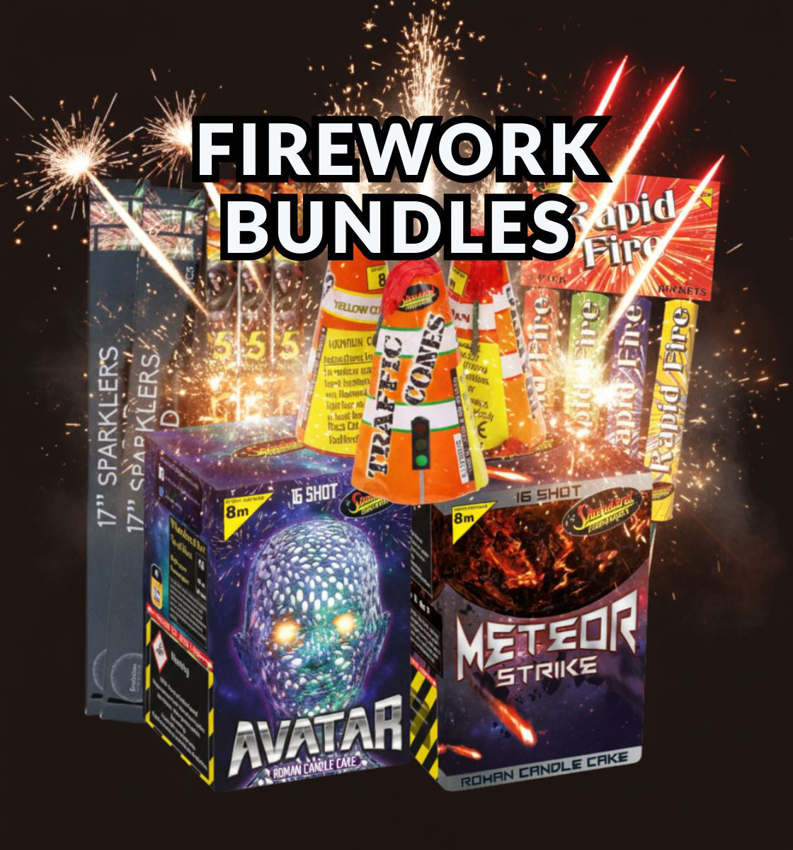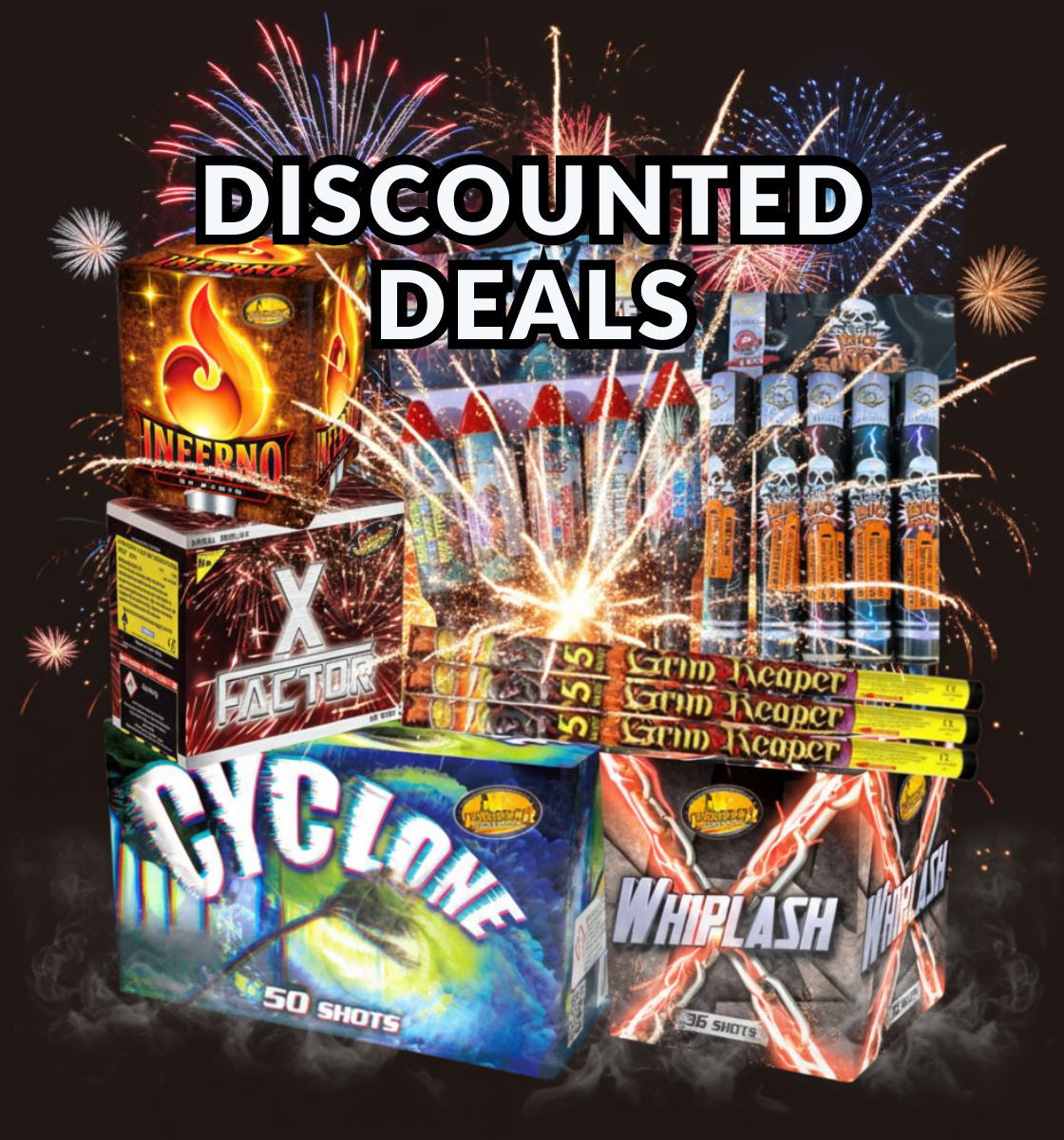Our extensive selection of fireworks includes Selection Boxes - Perfect for those who want a little bit of everything; Barrages & Cakes - For a grand display that will wow your guests; Rockets - Shoot up into the sky for that breathtaking burst of color; Fountains - Create sparkling effects that light up the night; Fun Snaps & Sparkles - Add some fun and excitement to any gathering; Smoke Grenades - Ideal for dramatic effects in photos and videos; Roman Candles & Catherine Wheels - Classic options that never go out of style; Display Kits - Everything you need for a professional-grade show.